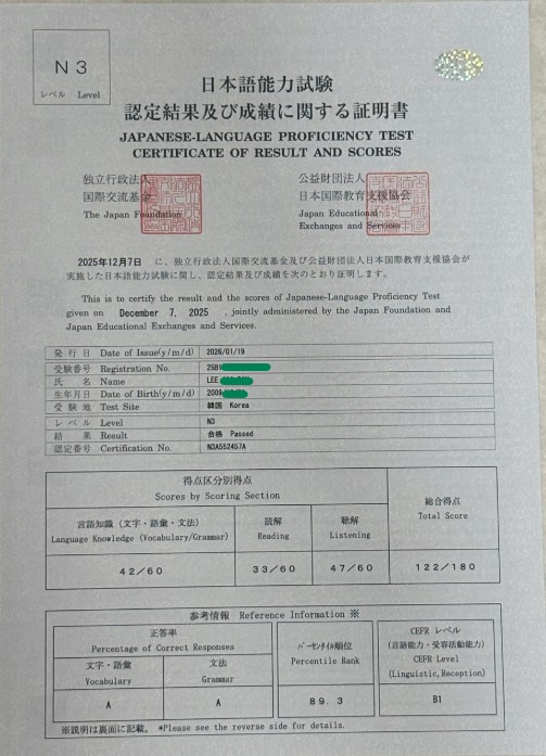 안녕하세요. 저는 **고등학교에 재학 중인 고등학생이고, 이번에 JLPT 시험에 합격했습니다. 시험 결과를 확인했을 때 정말 기뻤고, 준비하면서 도움을 많이 받았던 수업이 떠올라 후기를 남기게 되었습니다. 이번 시험에서 언어지식, 독해, 청해 영역별로 점수가 나왔는데, 전체적으로 제가 예상했던 것보다 더 괜찮게 나와서 안심했습니다. 특히 언어지식은 선생님과 함께 공부했던 내용이 실제 시험과 비슷하게 느껴졌습니다. 문법이나 어휘를 정리할 때 무작정 외우기만 한 것이 아니라, 문제집을 통해 자주 나오는 유형을 반복해서 풀어보고 헷갈리는 부분을 바로바로 짚어주셔서 훨씬 정리하기 쉬웠습니다. 시험장에서도 “이건 수업 때 봤던 방식이랑 비슷하다”는 느낌이 들어서 생각보다 안정적으로 풀 수 있었습니다. 반면에 독해는 개인적으로 가장 어렵게 느껴졌던 파트였습니다. 지문 길이도 길고, 시간 안에 정확하게 이해하면서 푸는 게 생각보다 쉽지 않아서 시험 볼 때도 부담이 있었습니다. 그래도 수업하면서 독해 문제를 그냥 정답만 맞히는 식으로 끝내지 않고, 왜 이 답이 맞는지, 어떤 문장이 핵심인지 같이 분석해 본 경험이 있어서 끝까지 포기하지 않고 풀 수 있었습니다. 아쉬움은 남지만, 독해를 준비하는 과정 자체가 실력 향상에 정말 도움이 많이 됐다고 느꼈습니다. 청해는 평소에 괜찮다고 생각했던 영역이었는데, 실제 점수를 보니 가채점했던 것과 조금 차이가 있어서 아마 중간에 실수한 부분이 있었던 것 같습니다. 그래도 청해 역시 수업 때 다양한 문제를 접해보고, 자주 나오는 표현이나 대화 흐름을 익혀둔 덕분에 시험장에서 덜 긴장하고 들을 수 있었습니다. 무엇보다 가장 도움이 됐던 건 시험 직전에 선생님과 모의고사처럼 문제를 풀어보고, 오답을 꼼꼼히 정리했던 과정이었습니다. 틀린 문제를 단순히 다시 푸는 데서 끝나는 게 아니라, 제가 왜 틀렸는지, 어떤 부분에서 헷갈렸는지를 같이 확인하면서 약점을 정리할 수 있었고, 그게 실전에서 큰 도움이 되었습니다. 막연하게 공부할 때보다 훨씬 효율적으로 준비할 수 있었고, 시험 직전까지 방향을 잃지 않고 공부할 수 있었습니다. 혼자 준비했다면 어디를 중점적으로 봐야 할지 몰라서 더 비효율적으로 공부했을 것 같은데, 수업을 통해 중요한 포인트를 중심으로 정리할 수 있어서 좋았습니다. 특히 학교 공부와 병행해야 해서 시간이 많지 않았는데, 제한된 시간 안에서 필요한 부분을 집중적으로 준비할 수 있었던 점이 가장 만족스러웠습니다. 이번 JLPT를 준비하면서 일본어는 단순히 많이 공부하는 것보다, 자주 나오는 유형을 정확히 알고 반복해서 연습하는 것이 정말 중요하다고 느꼈습니다. 그런 점에서 이번 수업은 실전 대비에 큰 도움이 되었고, 덕분에 좋은 결과까지 얻을 수 있었던 것 같습니다. JLPT를 준비하는 다른 학생분들에게도 추천하고 싶습니다. 저처럼 학교생활과 병행하면서 시험을 준비하는 학생들에게 특히 도움이 많이 될 것 같습니다. 이번 합격을 계기로 앞으로도 일본어 공부를 더 꾸준히 해보고 싶습니다.