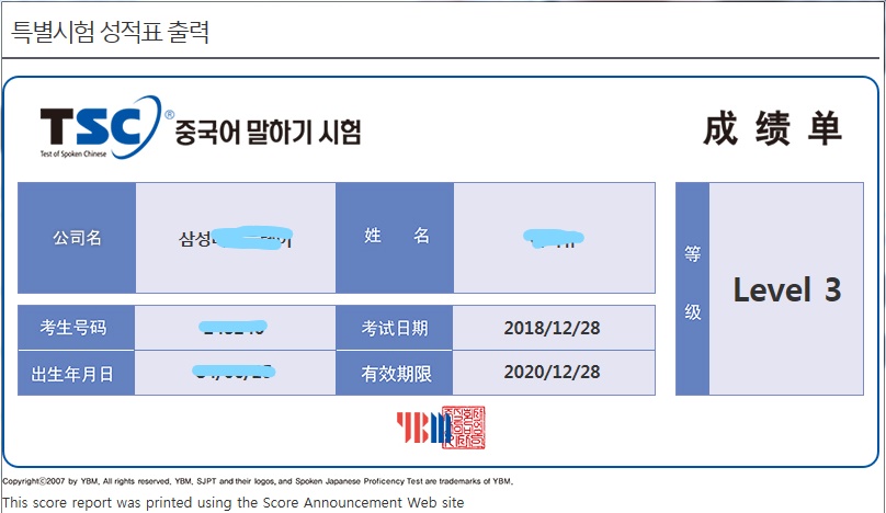 중국어는 고등학교 때 제2외국어로 조금 배운 게 전부였습니다. 그것도 병음만 겨우 읽는 수준이었고 단어나 문장들은 거의 다 잊어버린 상태였습니다. 이런 상황에서 승격 포인트 취득을 위해 단 몇 개월 안에 TSC 3급을 따야할 생각을 하니 막막했습니다. 처음엔 사내 왕초보 강좌를 두 달 정도 수강했습니다. 까먹었던 성조와 기본 어휘들에 대한 감은 어느 정도 되찾았지만 시험을 응시하기엔 턱없이 부족한 수준이었습니다. 그 후엔 시중에 판매하는 TSC 3급 교재를 구입해, 혼자 2개월 정도 공부했습니다. 시험 유형도 파악하고 답변패턴에 대해서도 어느 정도 익숙해졌다고 생각했지만 결과는 계속 2급 밖에 나오지 않았습니다. 특단의 조치가 필요했습니다. 학원비가 조금 부담스럽긴 하지만 내 문제점이 무엇인지 정확히 진단하기 위해서는 일대일 수업이 필요하다고 생각해 학원의 문을 두드렸습니다. 강사님께서는 제 발음이나 성조 중 잘못된 부분을 하나하나 짚어주셨고, 교재에 있는 모범답변을 제 수준에 맞게끔 수정하여 맞춤 스크립트를 짜주셨습니다. 실제 실전처럼 문제를 듣고 시간 내 답변하는 연습도 해보구요. 스로도 조금씩 자신감이 붙었고 간단한 스크립트 정도는 혼자서도 만들 수 있는 수준이 되었습니다. 학원은 16시간 으로 신청했는데 10시간 정도 수강한 후 목표등급인 3급을 취득할 수 있었습니다.