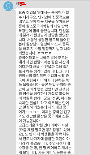 요즘 취업을 위해서는 중국어가 필수 더라구요. 단기간에 집중적으로 배우고 싶어 이곳 저곳을 찾아보던 중에 원스중국어학원의 매일 방학 특강반이 맘에 들었습니다. 단걸음에 달려가 원장님과 상담을 받았습니다. 처음엔 상담만 받으러 들어갔는데 원장님의 열정에 어느새 등록을 하고 첫 수업 일정까지 받고 나와버렸습니다. ㅎㅎㅎㅎ 중국어라고는 니하오 밖에 모르는 내가 과연 한달이라는 짧은 시간에 어디까지 배울 수 있을까 그냥 즐겨보자 하는 생각이었습니다. 그러나 원장님의 열정적인 수업과 생활 중국어 꿀팁까지 더해지니 실력은 쑥쑥 올랐습니다. 물론 매일 반이라 중간에 고비가 몇번 있었지만 선생님의 정성을 생각하니 저절로 발걸음이 학원을 향하더군요. 정말, 하라는 숙제만 열심히 하고 외우라는 단어만 열심히 외웠는데 제 입에선 중국어가ㅋㅋㅋㅋ. 이제는 중국인 친구와도 간단한 문장은 중국어로 소통이 가능합니다. 고급스러운 학원 인테리어와 시설(요즘 제일 필요한 공기청청기 있어요), 또 반 마다 학생들을 꽉꽉 채워서 진도 나가기에 급급한 학원이 아니라 참 좋았습니다. 수업시간 내내 수강생 한 명, 한 명 케어하고 계시는게 보입니다. 저는 이제 입문반을 졸업하고 기초반으로 넘어갑니다! 스파르타 단기 집중이 필요하신 분이라면 무조건 방학특강 강추드려요!!