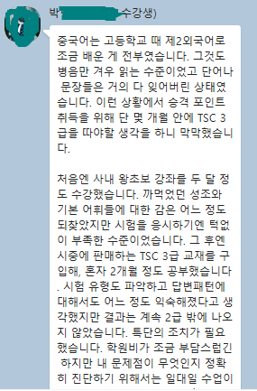 처음에는 안될 줄 알았습니다. 진급을 위해 어학점수가 필요했고 지푸라기라도 잡는 심정으로 3주의 기간을 남기고 학원 문을 두드렸습니다. 왜이리 늦게 찾아갔는지 후회가 되더군요. 그러나 원장쌤께서 한 번 해보자고 힘을 주셨고 매일 2시간씩 주5일 공부가 시작되었습니다. 성조가 어려웠는데 매일 보내주시는 녹음을 듣고 따라하며 부족한 부분을 연습했습니다. 매일 숙제를 내주셔서 숙제를 하느라고 게으른 제가 마음을 잡고 공부를 할 수 있었습니다. 기초문법을 차근차근 학습하고, 이후에 실전 문제 연습을 시켜주셔서 시험에 대한 감을 키웠습니다. 무엇보다 원장님께서 포기하지 않고 끝까지 도와주셔서 3주만에 TSC3급을 취득할 수 있었습니다.