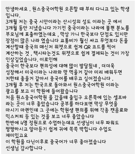 안녕하세요! 원스중국어학원이 막 오픈했을 때 부터 지금까지 다니고 있는 수강생 입니다. 저는 중국 시안이라는 곳에서 3개월동안 지냈습니다. 가기 전 중국이라는 나라의 불편함을 부모님께 표출했었는데요, 막상 가보니 물론 단점도 있었지만 장점도 많은 나라였습니다. 교통비가 한국보다 훨씬 저렴했고, 무엇보다QR코드로 쉽게 결제하는것이 가장 인상깊었습니다. 이로 인해서 중국이 한국보다 더 발달된 것들도 있구나 라고 알수 있었고, 점차 성장하는 중국의 모습을 보게 되어 중국어를 배워두면 도움이 될 것이라는 생각이 들어서 중국어를 배우고 싶어졌습니다. 한국으로 돌아와서 원스중국어학원의 광고를 보고 등록하였습니다. 학원 출입문 쪽에 있는 셀프바가 너무 좋았습니다. 공부를 하다보면 막상 무엇을 마시기 마련인데 그 곳에는 수강생 편의를 위해 각종 캔음료와 커피등이 있는것을 보고 너~무 좋았습니다. 한 반에 4명 정원으로 수업을 했는데 선생님이 파워 넘치시고 알아듣기 쉽게 설명해 주셔서 귀에 쏙쏙 박히는 강의를 들을 수 있었습니다. 학원을 다닌 이후로 중국어가 너무 좋아졌습니다. 선생님 감사합니다 ^^