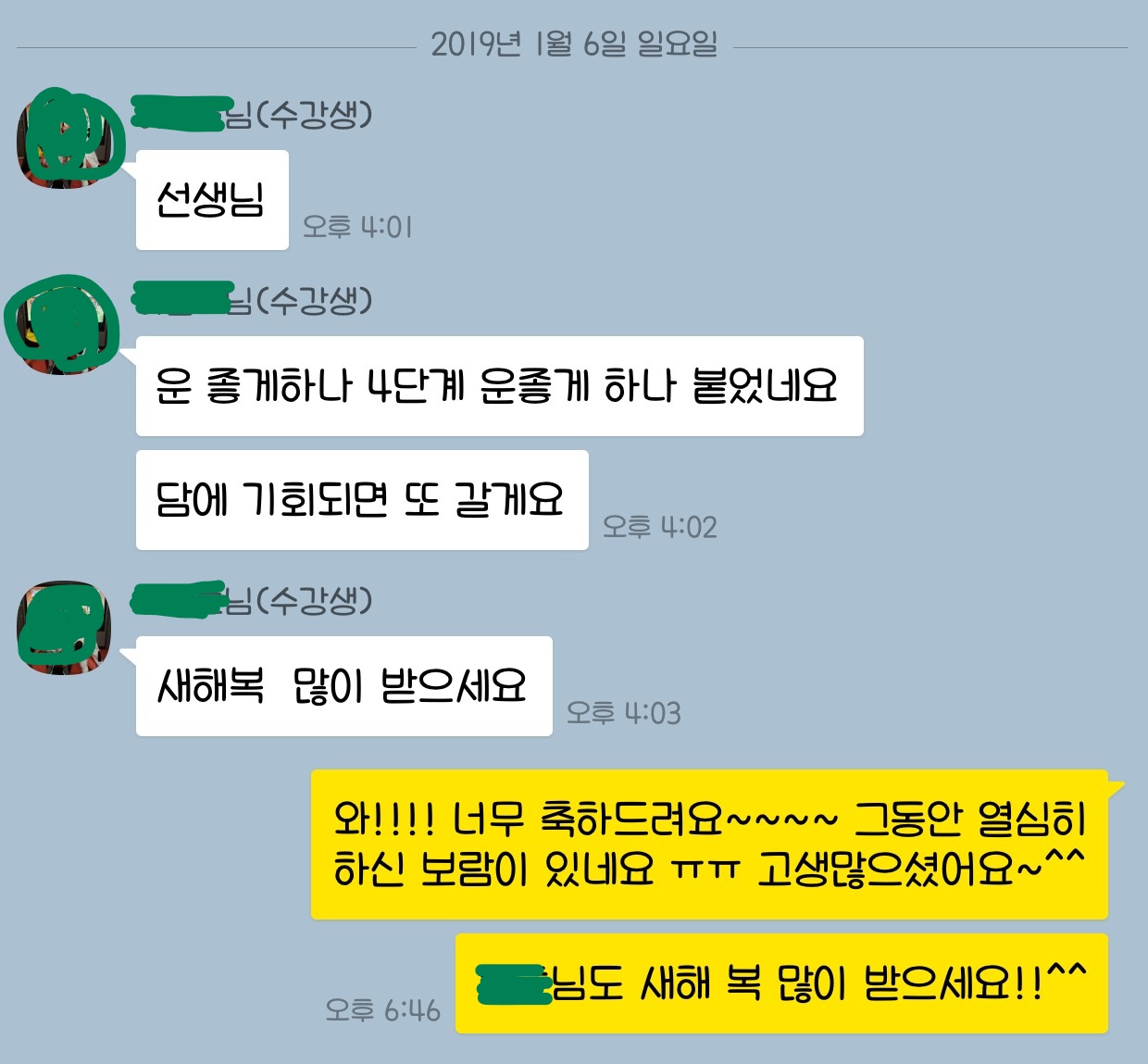 최재원 강사 강의전략: <**호님 22시간 강의후기> 처음 학원에 방문하셨을 때 이미 10개가 넘는 3급 성적표를 가지고 계셨고, 이미 타 학원에서 수십시간의 1:1 수업을 들으셨지만 여전히 목표인 4급을 취득하지 못하시고 방문 상담을 진행하셨습니다. 연말시험까지는 한달 반 남짓이 남은 상태였고 간단히 레벨테스트를 진행하고는 4급 취득가능 여부를 재차 확인하셨습니다. 레벨테스트 결과 가장 큰 문제점은 3파트에서 문장을 말할 때 복잡한 어법의 오류가 가끔 발생하고 난이도 상의 문제는 듣기가 완벽하지 않았습니다. 그리고 4급 취득에서 가장 중요한 4파트에서 그동안 너무 무작정 암기식의 방식으로 공부한 탓에 유연성있는 답변이 전혀 불가능한 상태였습니다. 일단 기존에 암기하셨던 많은 답변들을 테마별로 추려내서 문장으로 쪼개는 방식으로 수업을 진행하기 시작했습니다. 그 후에 문장단위로 쪼개어진 모범답변들을 유연하게 조합하여 최대한 많은 질문을 커버하는 훈련이 진행되었고 마지막으로 많이 틀리는 성조 교정에 들어갔습니다. 월수금 빠지지 않고 학원에 오셔서 쉽지 않은 성조교정까지 받으시느라 너무 고생하셨고 목표 이루게 되셔서 축하드립니다.