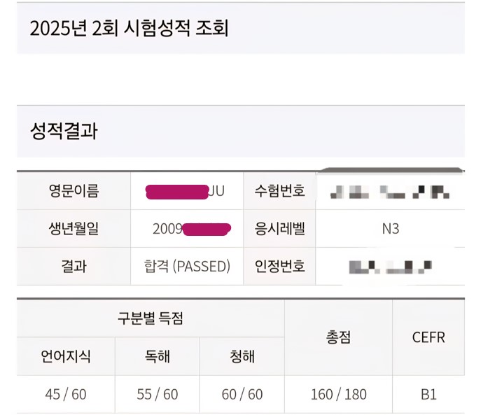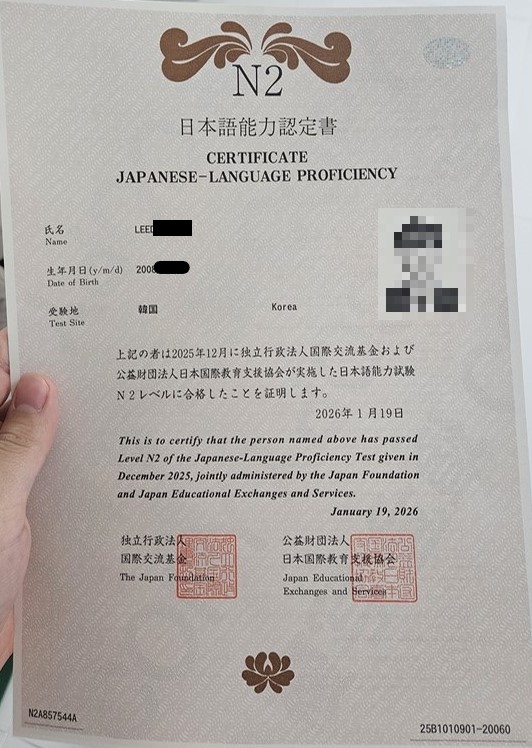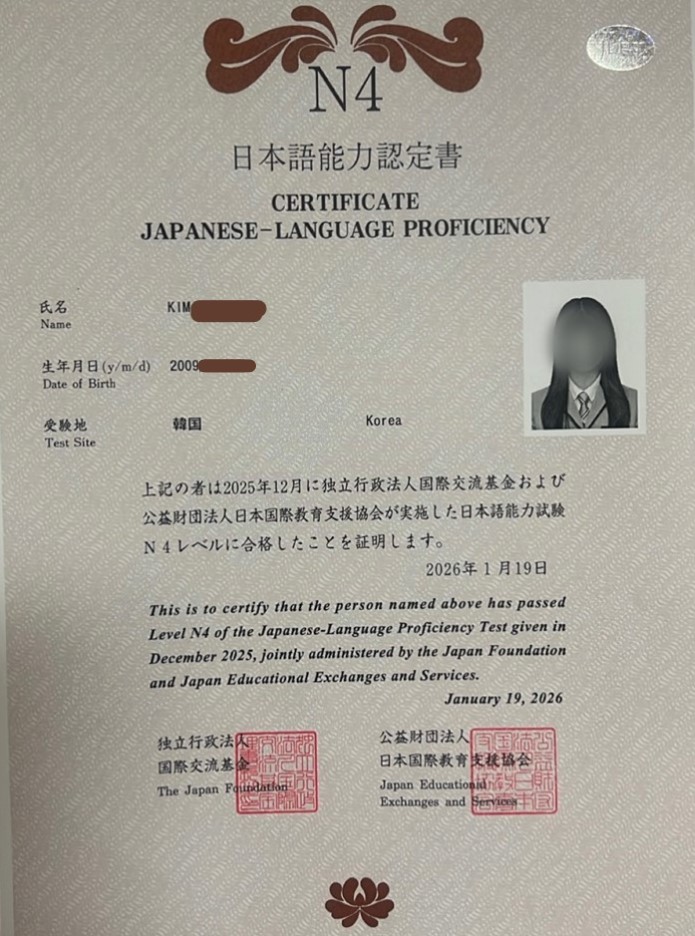 안녕하세요! 이번에 JLPT N3에 합격한 고등학교 2학년 학생입니다 :) 저는 원래 일본 애니메이션을 좋아해서 일본어에 관심은 있었지만, 따로 제대로 공부해본 적은 없었고 독학으로 N5 정도의 아주 기초만 알고 있는 상태였어요. 히라가나, 가타카나 읽고 간단한 표현만 아는 수준이라서 N3는 솔직히 처음엔 너무 어렵게 느껴졌습니다. 그래서 원스어학원에서 1:1 수업을 시작하게 되었고, 주 2회씩 약 5개월 동안 준비해서 이번에 N3 시험에 합격하게 되었어요! 혼자 공부할 때는 무엇부터 해야 할지 몰라서 막막했는데, 1:1 수업이다 보니까 제 수준에 맞춰서 부족한 부분 위주로 수업을 진행해 주신 게 정말 큰 도움이 됐어요. 저는 특히 문자·어휘 쪽이 약해서 그 부분을 집중적으로 공부했는데, 선생님께서 계속 반복해주시고 체크해주셔서 많이 늘 수 있었던 것 같아요. 단어도 매번 숙제로 외워가고, 문법도 예습·복습을 꾸준히 하려고 노력했는데, 그게 점수로 바로 연결된 것 같아서 뿌듯했습니다. 그리고 저는 애니메이션을 좋아해서 그런지 청해는 원래 조금 자신 있었는데, 이번 시험에서도 청해는 만점을 받을 수 있어서 더 기뻤어요! 대신 부족했던 부분을 학원에서 정확하게 보완해준 덕분에 전체적으로 균형 있게 점수를 올릴 수 있었습니다. 혼자였으면 절대 이 기간 안에 N3까지는 못 왔을 것 같아요. 방향을 잡아주시고 계속 관리해주신 덕분에 가능했다고 생각합니다. JLPT 준비하시는 분들, 특히 저처럼 기초만 있는 상태라면 1:1 수업 정말 추천드려요!