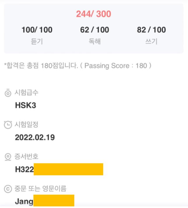 CHIU SHIH HAN 강사 강의전략: 먼저, 3급 고득점으로 취득한 장** 학생 축하합니다. 장**학생은 처음에는 종합회화 수업을 진행했었습니다. 그래서 HSK준비를 막 시작했을 때 시험에 나오는 어휘가 부족하여 문제 이해를 잘 못하는 문제가 있었습니다. 초반에 시험유형분석과 풀이 스킬 위주의 수업을 했고, 덕분에 아주 빠르게 시험에 적응하는 모습을 보여주었습니다. 또한, 본인이 스스로 오답 노트를 만들어 모의고사에서 틀렸던 문제의 어휘와 어법을 잘 복습하여 점수가 눈에 띄게 빠른 속도로 올랐습니다. 이러한 과정을 통하여 목표로 하는 급수에 빠르게 도달한 소식을 듣게되어 정말 기쁩니다! 장** 학생과 함께 수업했던 시간은 너무나 즐거웠고, 다음 방학 때 4급 취득도 문제 없을것으로 보여집니다. 다시 한번 축하합니다.
