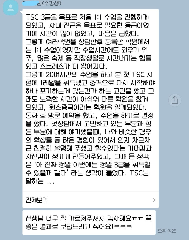 CHIU SHIH HAN 강사 강의전략: 신**님은 1년이 넘는 시간동안 정말 성실하고 꾸준하게 중국어학습을 진행하셨습니다. 중국어교재를 총 3권 마스터 하신 상황이셔서 기초가 매우 탄탄하셨습니다. 그랬기 때문에 TSC 3레벨 정도는 바로 취득 가능하실거라고 예측했지만, 초반에 생각치 못한 난관에 부딪혔습니다. 바로, 1년동안 자유로운 환경에서 회화를 하셨기 때문에 시험유형에 맞춰서 시간안에 답변하시는 것에대해 부담을 느끼셔서 실력발휘가 잘 되지 않는다는점이었습니다. 당시 본인의 실력대비 성적이 너무나 좋지 않게 첫 시험결과를 받아서 본인도 저희 강사진도 많이 속상했지만 바로 다시 힘을 내어 분석이 들어갔습니다. 저희는 욕심내지 않고, 시험 파트별 유형에 맞춘 스크립트로 연습했고, 시험 때 긴장하셔서 자주 실수하시는 발음과 성조교정 위주로 수업을 진행했습니다. 당연한 결과지만 총 8시간의 시험대비 수업으로 바로 원하시는 급수를 취득하실 수 있었고, 워낙에 기초가 탄탄하신 분이기 때문에 상위급수도 빠른시일내에 취득 가능할 것이라고 예상하고있습니다. 시험합격 축하드리고 앞으로도 찌아요우!! 입니다!! ^^