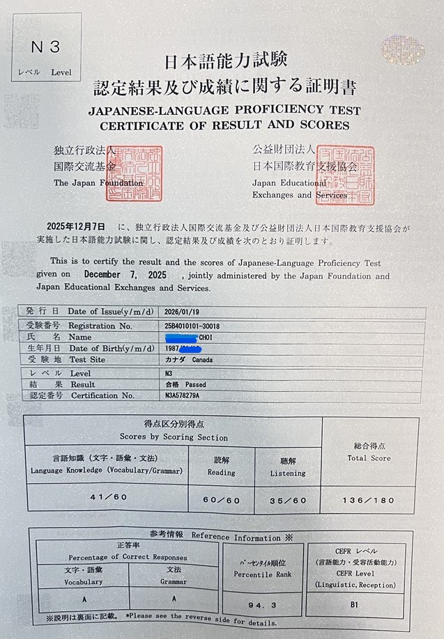 안녕하세요. 저는 **고등학교에 재학 중인 고등학생이고, 이번에 JLPT 시험에 합격했습니다. 시험 결과를 확인했을 때 정말 기뻤고, 준비하면서 도움을 많이 받았던 수업이 떠올라 후기를 남기게 되었습니다. 이번 시험에서 언어지식, 독해, 청해 영역별로 점수가 나왔는데, 전체적으로 제가 예상했던 것보다 더 괜찮게 나와서 안심했습니다. 특히 언어지식은 선생님과 함께 공부했던 내용이 실제 시험과 비슷하게 느껴졌습니다. 문법이나 어휘를 정리할 때 무작정 외우기만 한 것이 아니라, 문제집을 통해 자주 나오는 유형을 반복해서 풀어보고 헷갈리는 부분을 바로바로 짚어주셔서 훨씬 정리하기 쉬웠습니다. 시험장에서도 “이건 수업 때 봤던 방식이랑 비슷하다”는 느낌이 들어서 생각보다 안정적으로 풀 수 있었습니다. 반면에 독해는 개인적으로 가장 어렵게 느껴졌던 파트였습니다. 지문 길이도 길고, 시간 안에 정확하게 이해하면서 푸는 게 생각보다 쉽지 않아서 시험 볼 때도 부담이 있었습니다. 그래도 수업하면서 독해 문제를 그냥 정답만 맞히는 식으로 끝내지 않고, 왜 이 답이 맞는지, 어떤 문장이 핵심인지 같이 분석해 본 경험이 있어서 끝까지 포기하지 않고 풀 수 있었습니다. 아쉬움은 남지만, 독해를 준비하는 과정 자체가 실력 향상에 정말 도움이 많이 됐다고 느꼈습니다. 청해는 평소에 괜찮다고 생각했던 영역이었는데, 실제 점수를 보니 가채점했던 것과 조금 차이가 있어서 아마 중간에 실수한 부분이 있었던 것 같습니다. 그래도 청해 역시 수업 때 다양한 문제를 접해보고, 자주 나오는 표현이나 대화 흐름을 익혀둔 덕분에 시험장에서 덜 긴장하고 들을 수 있었습니다. 무엇보다 가장 도움이 됐던 건 시험 직전에 선생님과 모의고사처럼 문제를 풀어보고, 오답을 꼼꼼히 정리했던 과정이었습니다. 틀린 문제를 단순히 다시 푸는 데서 끝나는 게 아니라, 제가 왜 틀렸는지, 어떤 부분에서 헷갈렸는지를 같이 확인하면서 약점을 정리할 수 있었고, 그게 실전에서 큰 도움이 되었습니다. 막연하게 공부할 때보다 훨씬 효율적으로 준비할 수 있었고, 시험 직전까지 방향을 잃지 않고 공부할 수 있었습니다. 혼자 준비했다면 어디를 중점적으로 봐야 할지 몰라서 더 비효율적으로 공부했을 것 같은데, 수업을 통해 중요한 포인트를 중심으로 정리할 수 있어서 좋았습니다. 특히 학교 공부와 병행해야 해서 시간이 많지 않았는데, 제한된 시간 안에서 필요한 부분을 집중적으로 준비할 수 있었던 점이 가장 만족스러웠습니다. 이번 JLPT를 준비하면서 일본어는 단순히 많이 공부하는 것보다, 자주 나오는 유형을 정확히 알고 반복해서 연습하는 것이 정말 중요하다고 느꼈습니다. 그런 점에서 이번 수업은 실전 대비에 큰 도움이 되었고, 덕분에 좋은 결과까지 얻을 수 있었던 것 같습니다. JLPT를 준비하는 다른 학생분들에게도 추천하고 싶습니다. 저처럼 학교생활과 병행하면서 시험을 준비하는 학생들에게 특히 도움이 많이 될 것 같습니다. 이번 합격을 계기로 앞으로도 일본어 공부를 더 꾸준히 해보고 싶습니다.