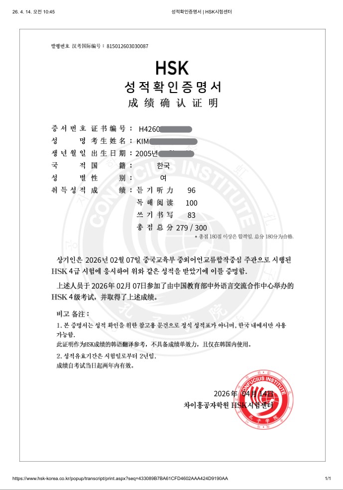 중국 드라마를 보다가 교환학생을 가야겠다는 마음이 들어, 무작정 학원을 등록하게 되었습니다. 당시 제 실력은 주워 들은 단어들로 맥락만 파악하는 수준이었습니다. 기초·회화 16회차와 4급 대비 8회차를 수강하면서, 짧은 시간 안에 자격증을 취득할 수 있을지 걱정이 많았습니다. 특히 한자를 외우는 것이 가장 큰 부담이었는데, 구쌤의 지도와 격려 덕분에 한자가 점점 글자로 느껴지기 시작했습니다. 선생님께서는 제 수준과 상황에 맞춰 수업해 주셨고, 수업 시간 외에도 아낌없이 도움을 주시려는 진정성이 저를 더 노력하게 만들었습니다. 무리한 도전이라고 생각했는데 예상보다 높은 점수로 합격하게 되어 정말 기쁩니다. 현재는 5급을 목표로 다시 구쌤과 함께 도전하고 있습니다. 선생님 감사합니다 !!